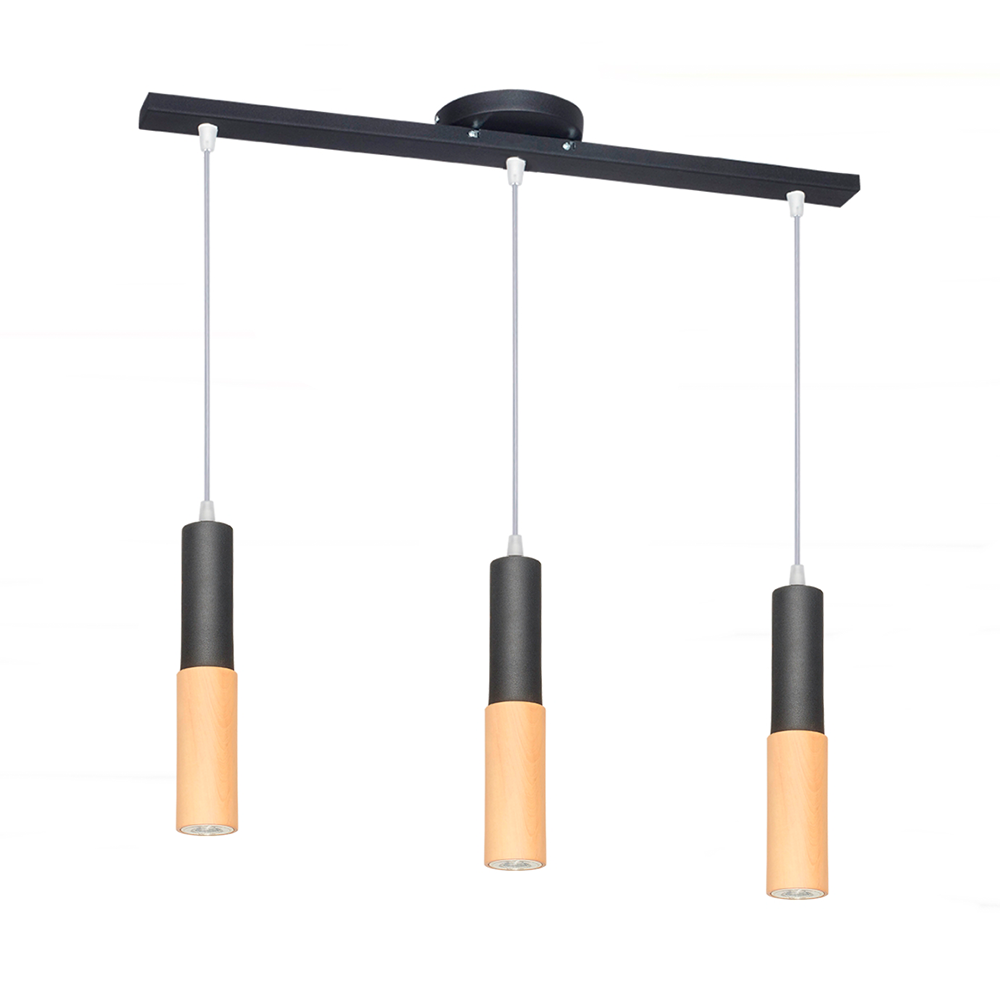 Colgante de 3 luces con madera y listón